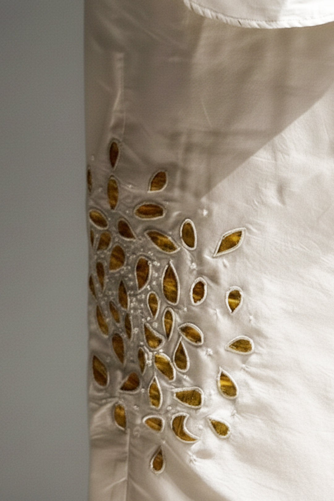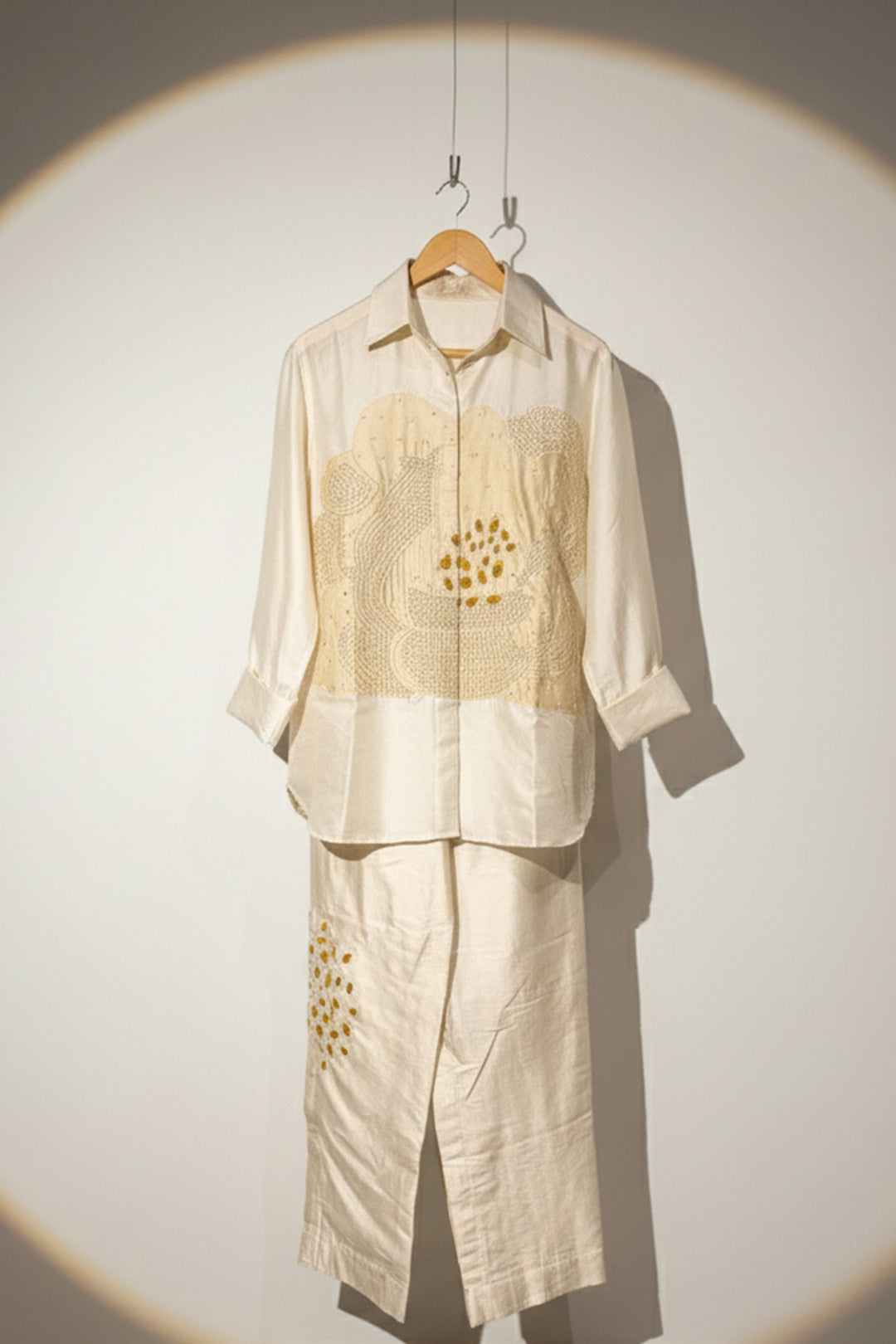 A tribute to exquisite style, this impeccably designed white silk shirt shines in the limelight. Made from 100% silk, this luxurious fabric offers a perfect surface for intricate hand embroidery. opt for this elegant piece for both casual daytime outings and cocktail evenings. Paired with off-white, yellow patchwork silk pant has been meticulously handcrafted and crafted with 100% silk fabric